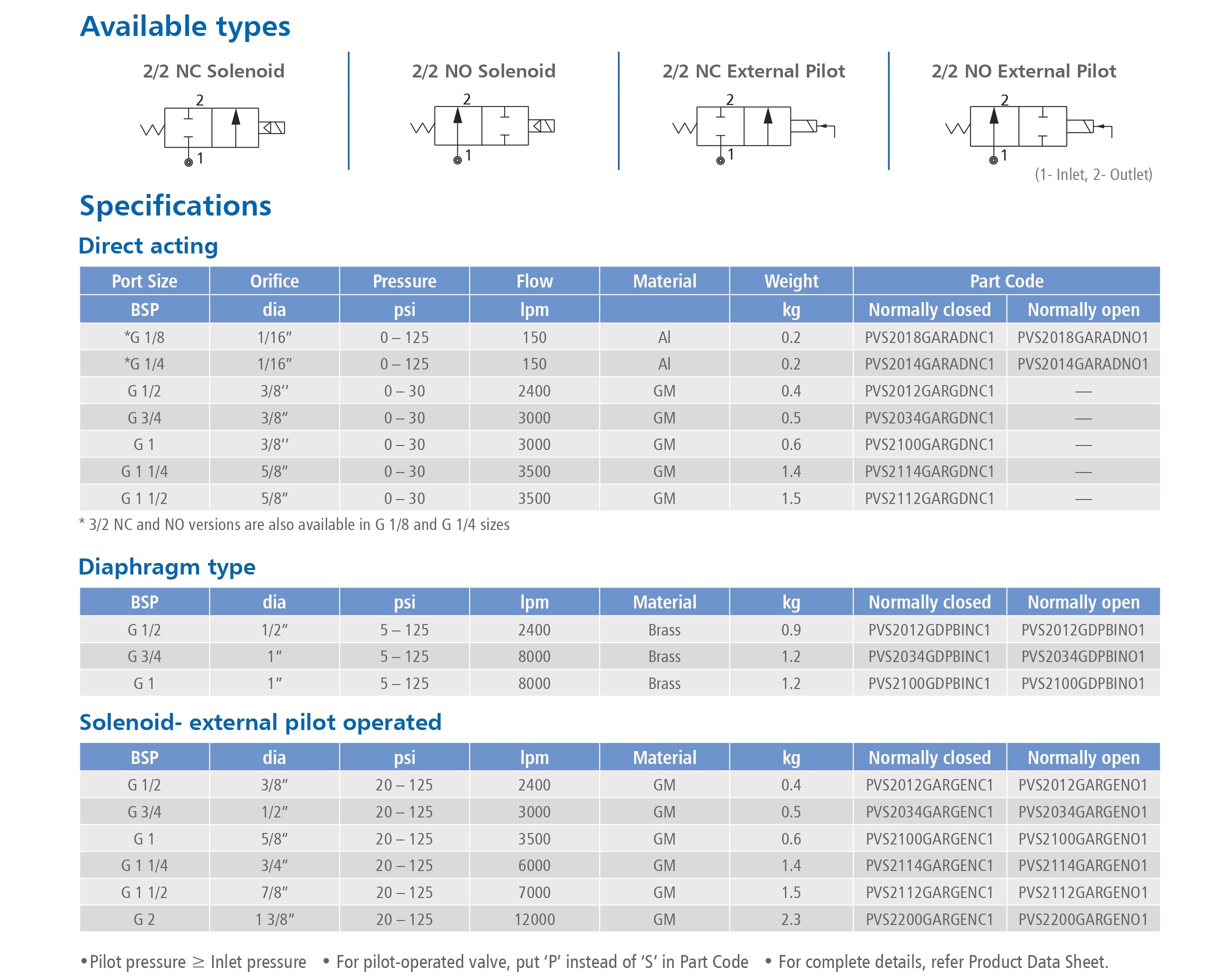 • Options: 2/2 NC, NO in solenoid and pilot version, Auto drain valve